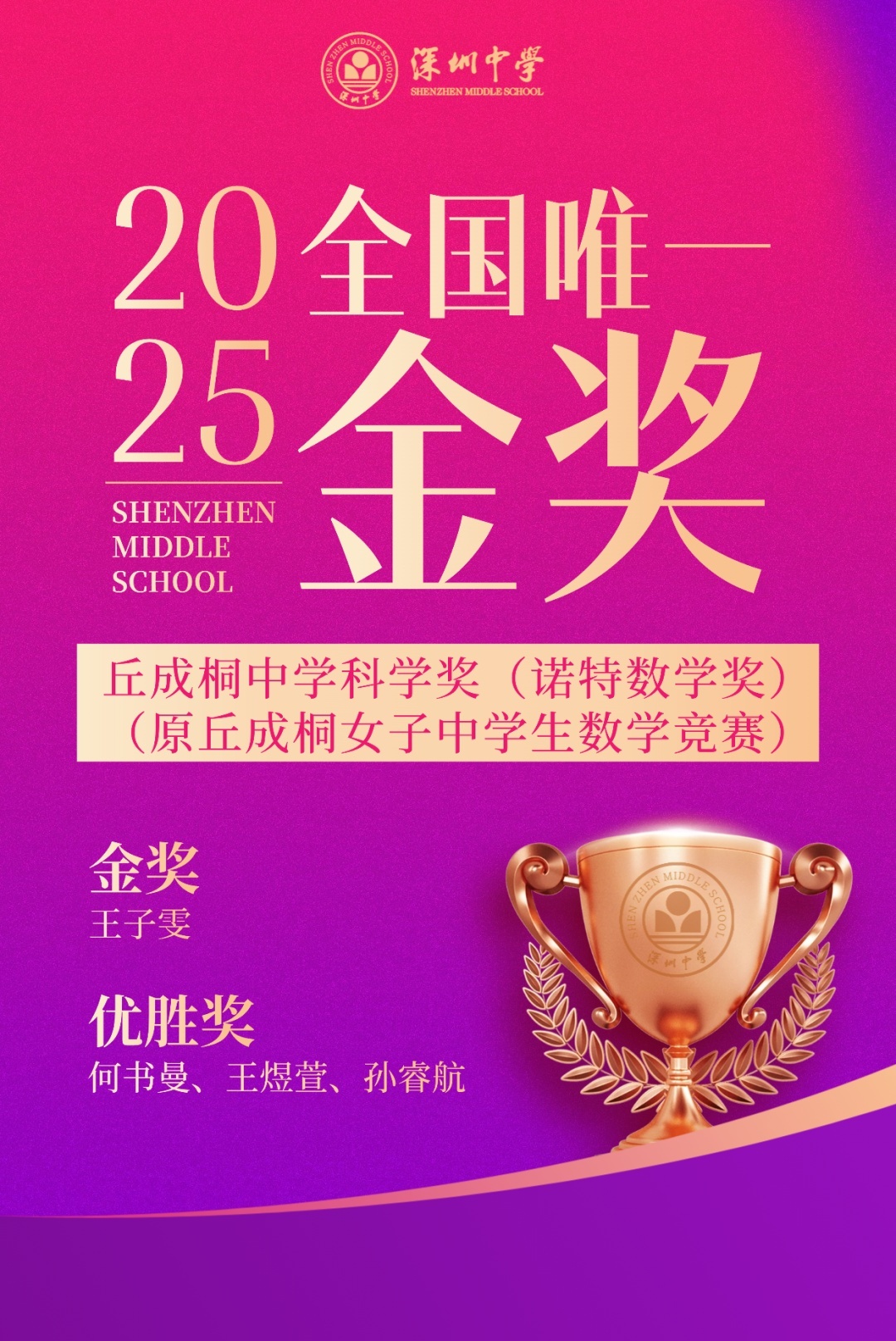11月3日,由清华大学主办的丘成桐中学科学奖(诺特数学奖)(原丘成桐女子中学生数学竞赛)奖项正式公布,最终评选出诺特奖金奖1人、银奖3人、铜奖6人,优胜奖10人。深圳中学高二数理英才班王子雯同学获唯一金奖,全国第一;何书曼、王煜萱、孙睿航三位同学获优胜奖。